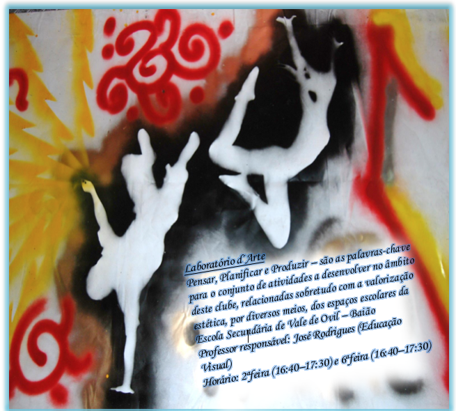 Pensar, Planificar e Produzir – são as palavras-chave para o conjunto de atividades a desenvolver no âmbito deste clube, destinado aos alunos do segundo e terceiro ciclos, relacionadas sobretudo com a execução de trabalhos artísticos diversificados, com recurso a variados materiais e técnicas, no sentido do desenvolvimento da criatividade, da imaginação e de competências e habilidades técnicas. Professores responsáveis: Helena Reis e José Rodrigues (Educação Visual / Educação Tecnológica) - horário: 3ªfeira (17:30-18:20) e 5ªfeira (17:30-18:20).